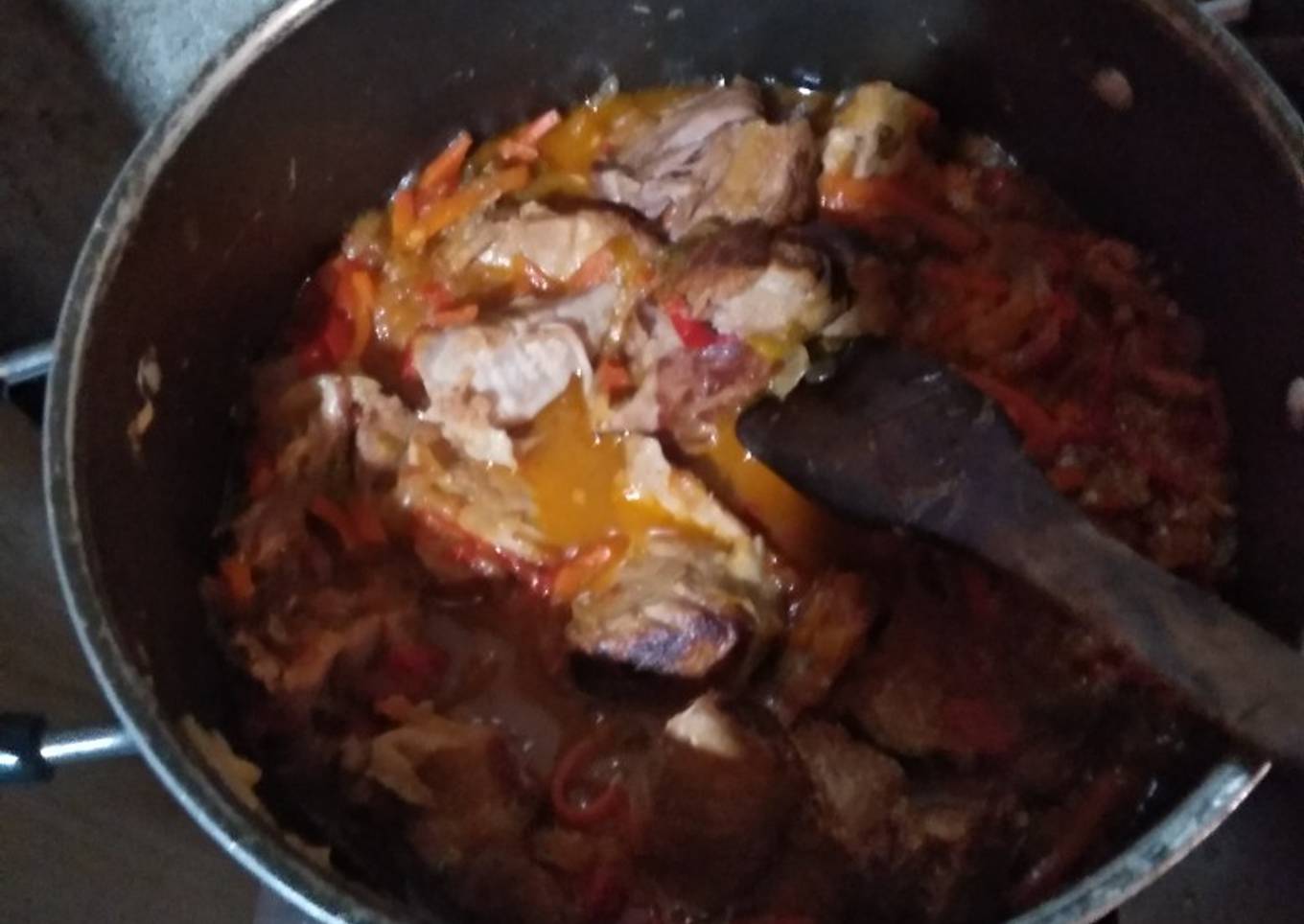 - En otra cacerola, sofritar cebolla y morrón. Salpimientar, agregar ajo y el pollo en cubos de 4 cm de grosor (para que no se desarmen luego). Agregar también en rodajas los chorizos y fritarlos bien, que queden dorados. Ponerlos en la cacerola de las lentejas, después de media hora en la que estas estén cocinándose. Luego poner el resto de los ingredientes.