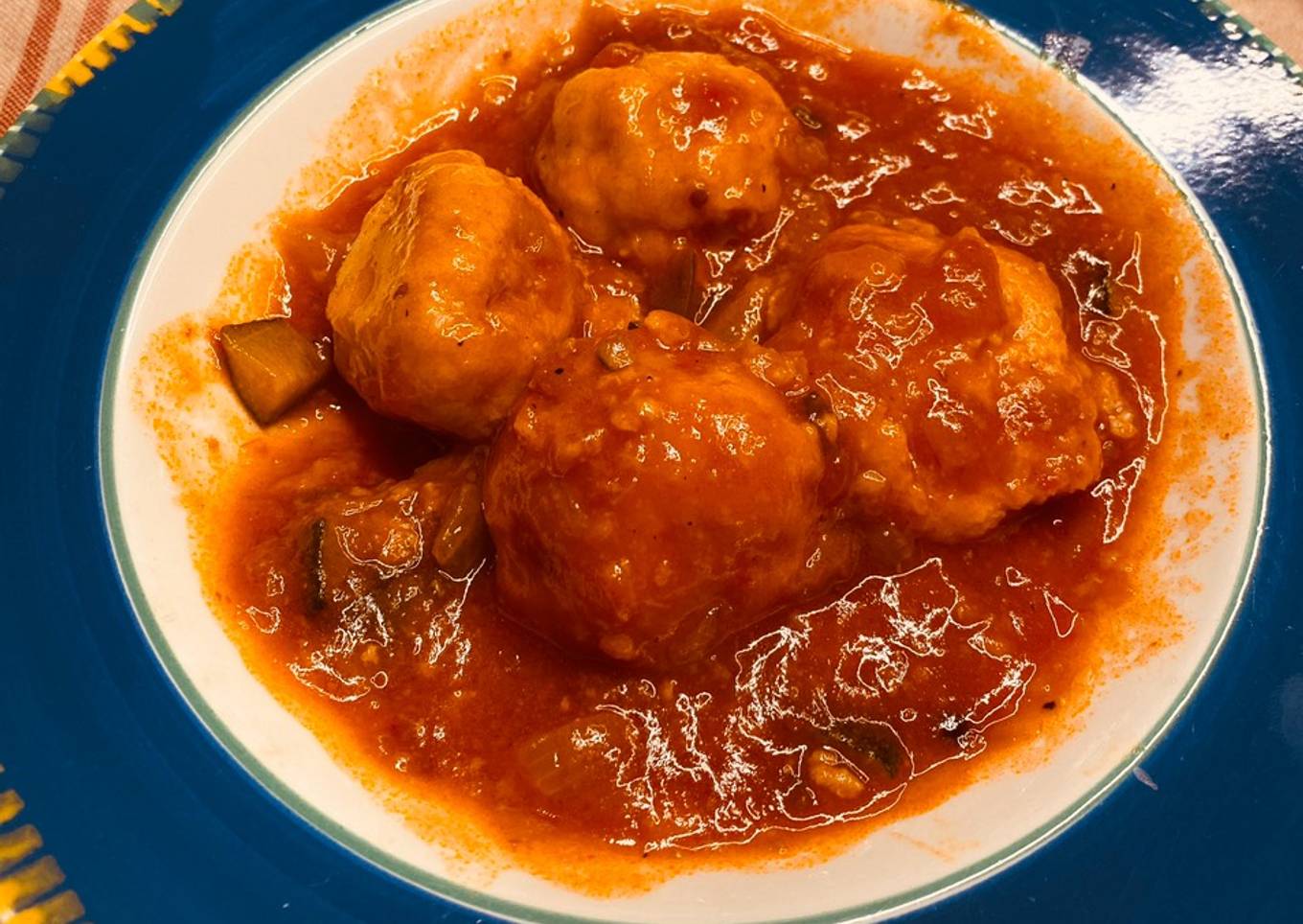 Albóndigas de merluza y bacalao con tomate y calabacín