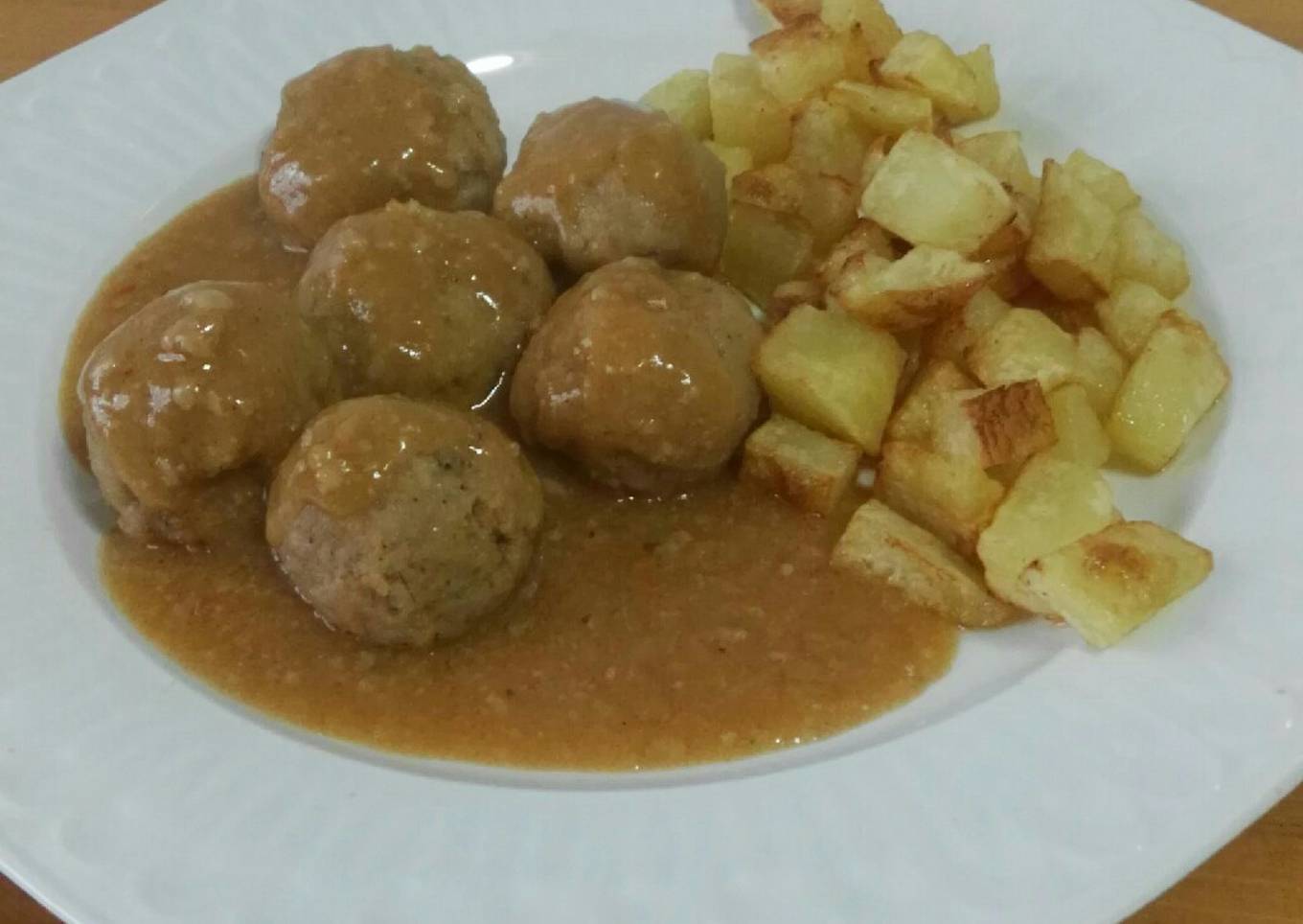 - Emplatamos regando las albóndigas con la salsa caliente y servimos recién hecho. Yo hoy con patatas fritas... Buen provecho!!!!!